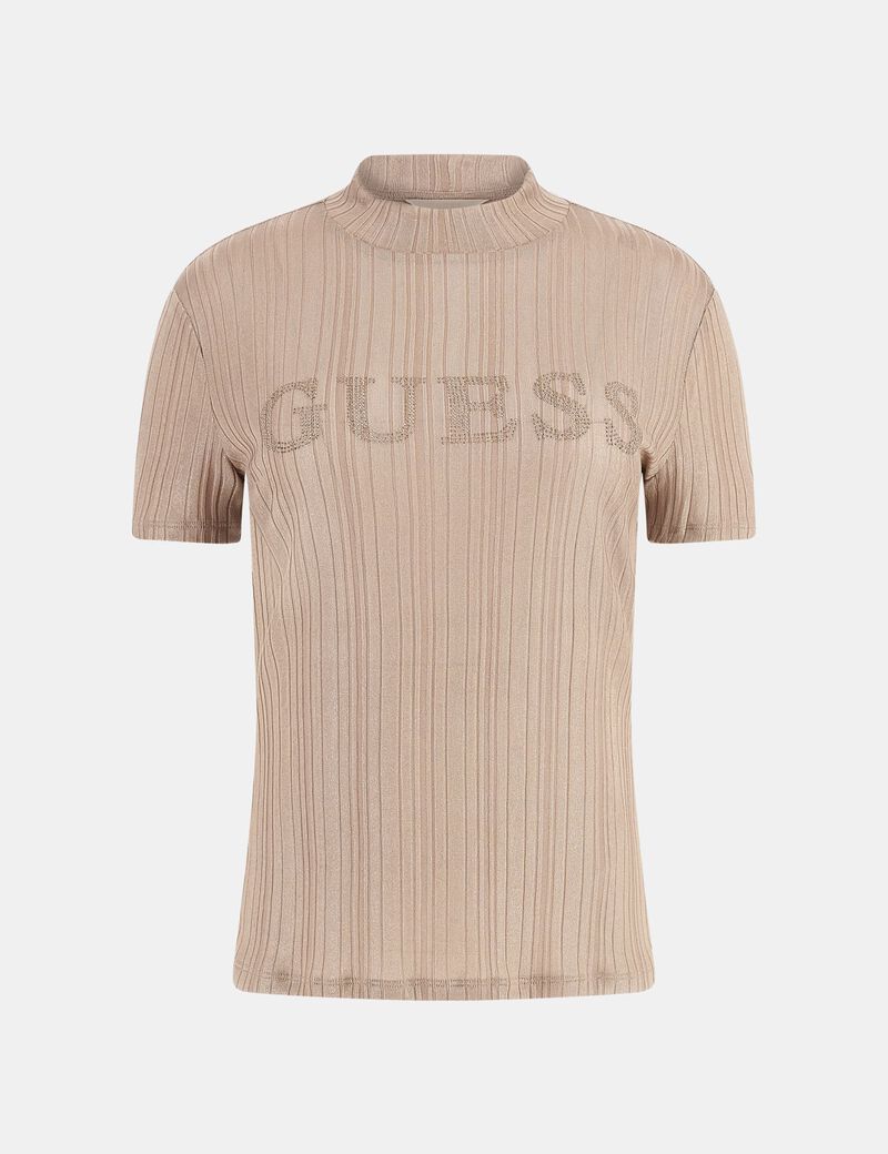 Synthetic fabric sweater top.High neck.Short sleeves.Slim fit.FABRIC TYPE: Rib knit.EMBELLISHMENTS: Rhinestones logo.Picture shows size S.Total length: 55 cm / 21.65 inch.True to size.SHELL (main fabric): 97%polyester 3%elastane.WASH LABEL: Wash max 30°C.