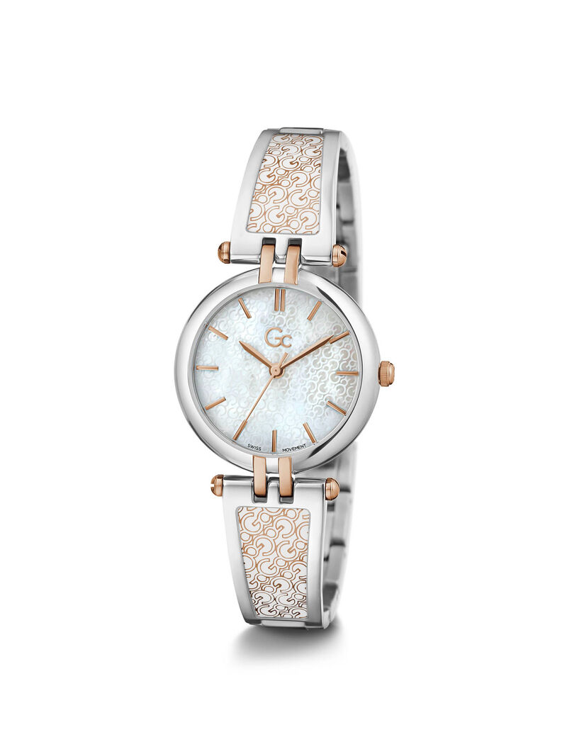 Sophisticated and glamours, this silver timepiece features a rose gold sunray dial. Finished with a logo printed bracelet.